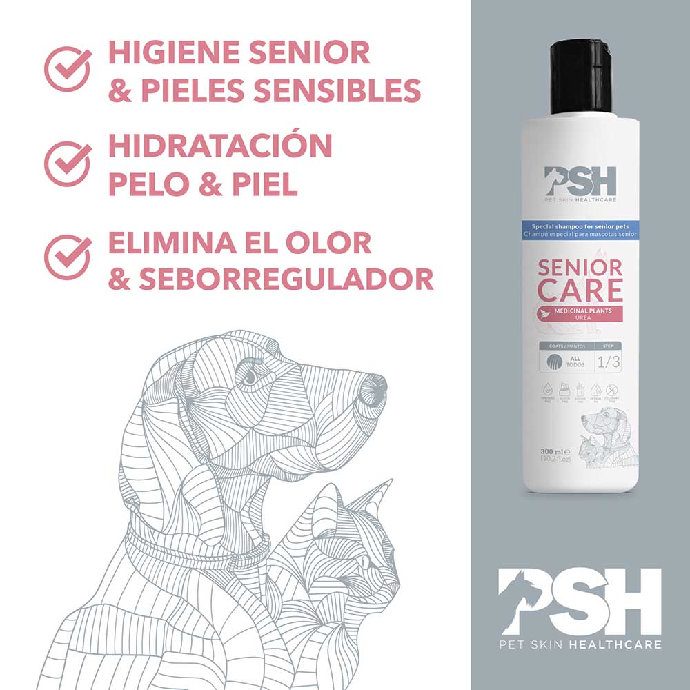 Eins og heitið segir er sjampóið sérstaklega ætlar fyrir eldri feld. Sjampóið er með virkum efnum sem stjórna lyktarsamsetningu sem einkennir oft feld á eldri hundum/köttum, og gerir lyktina meira hlutlausa. Er auk þess með virkum efnum frá plöntum til að vernda viðkvæman feld og sebum-regulating sem gefur næringu og raka. Hentar vel fyrir viðkvæman feld, er án litarefna, paraben, Khaton, sílikon og ofnæmisvaldandi lykt.